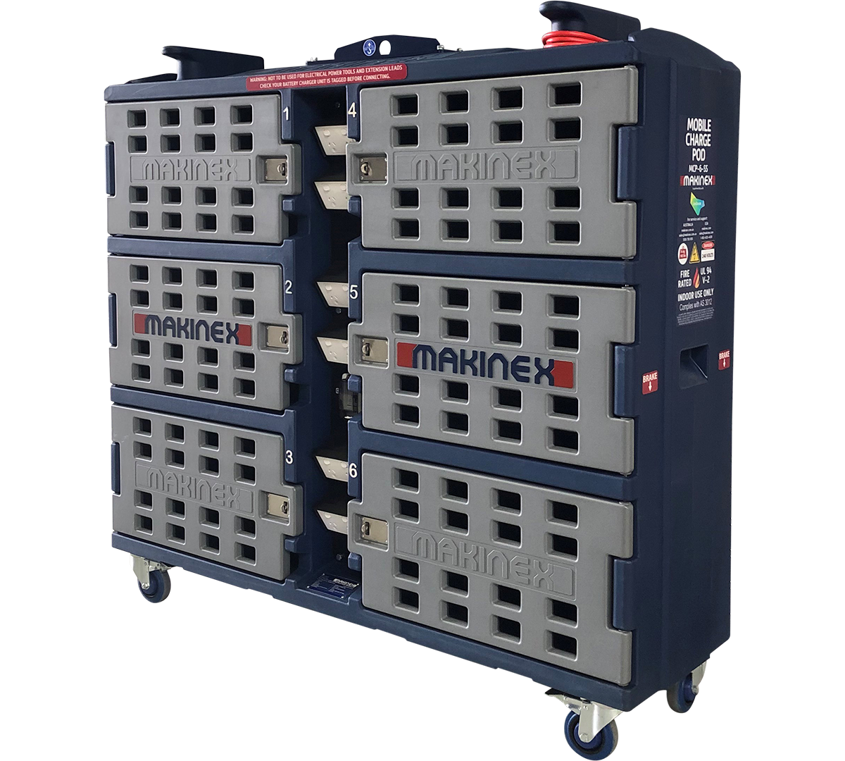 The Makinex Mobile Charge Pod is a safe, fire-retardant on-site battery storage and charging solution designed specifically for contractors, rental companies, and job sites