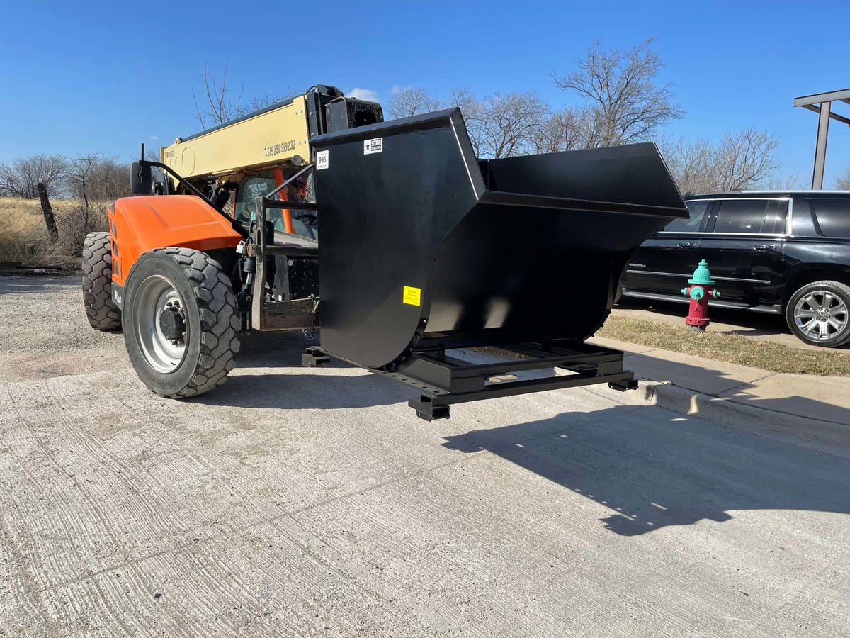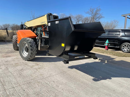 Each hopper features a self-dumping design that releases the load automatically when the bumper contacts the side of a dumpster or container. The heavy-duty return spring resets the hopper after dumping, keeping operations smooth and continuous. The large fork pockets allow fast transport and controlled dumping with minimal operator effort.